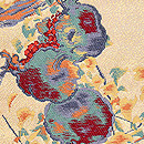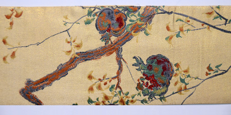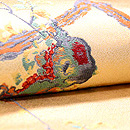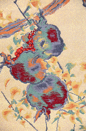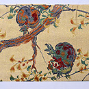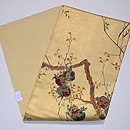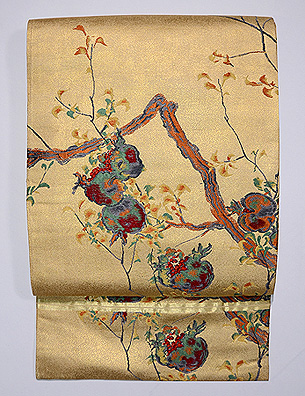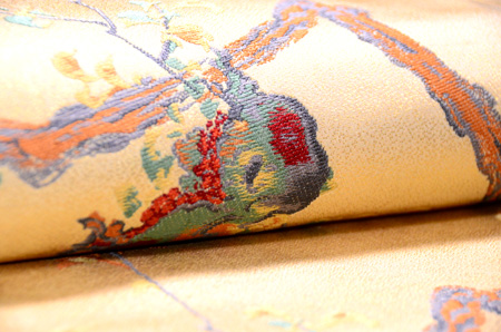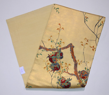 華やかな色たちと、かわいいデザインとの競演が成された秋の帯です。 全通なので開いてみると見事な美しさです。 巾が少し細いので、小柄な方にお勧めしたいです。