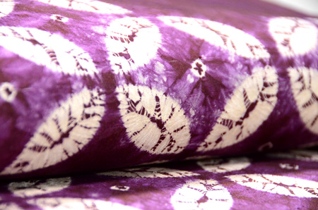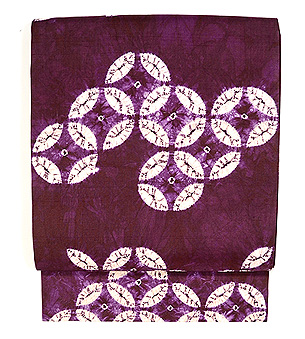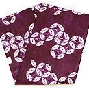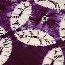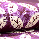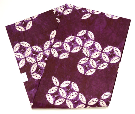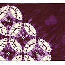 染料を何回もくぐった染めあとが地に残り、深みのある紫根染めとなっています。 七宝のまあるい重なりが白く宙に浮いて、リズミカルな表情をつくっています。