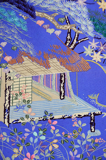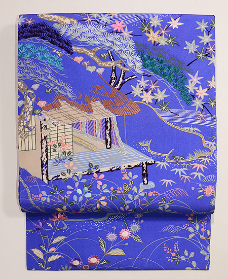 萩がそよぎ、紅葉の錦、彩りの秋。 寝殿作り御屋敷のある雅な風景。 めずらしい地色に細かな染と刺繍がほどこされた華やかな名古屋帯です。