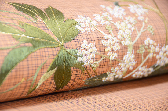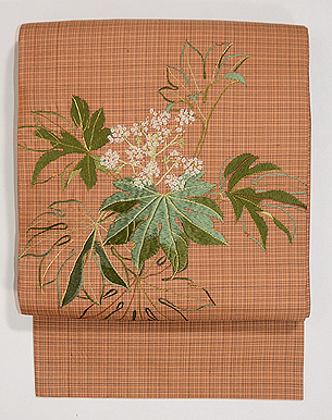 この季節にふさわしいお花はと探していましたら、ありました。 ツヤツヤと元気そうなお顔にかわいい白いお花をいっぱいつけて。 手がいっぱいあるからヤツデというそうですが、個性的な帯になりました。