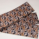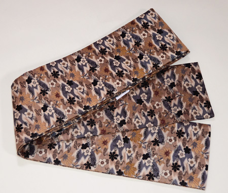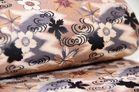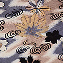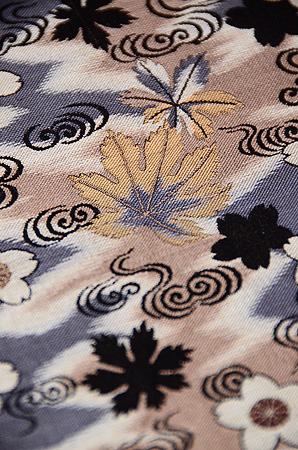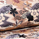 桜と紅葉が細やかに散らされた大人の半幅帯。 シックな色味で、品のある着こなしが叶います。 部分的に入った黒い織と渦巻き文様が、くっと粋な印象を生みます。