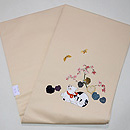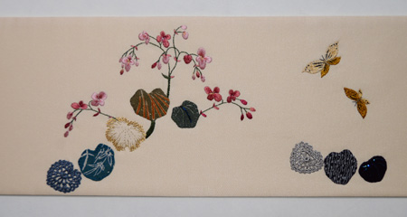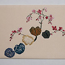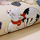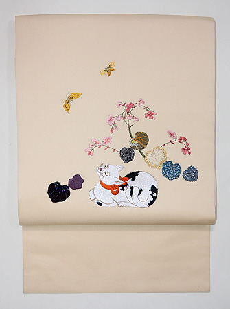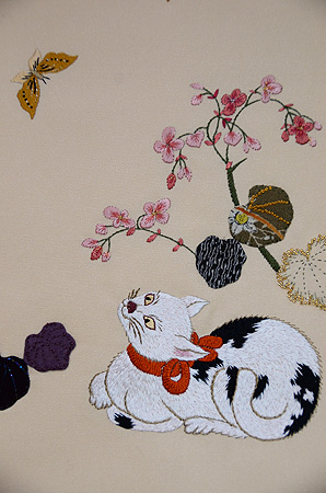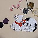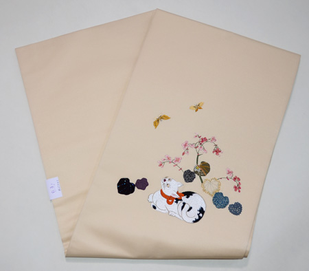 当店オリジナルの日本刺繍とコラージュの作品です。 黄金色の目で蝶々を見上げる猫ちゃんは、朱色のリボンをして、毛並みも気品高くおわします。 秋海棠の葉っぱを見ていただくと、色とりどりの江戸縮緬に、細かな細工が施してあるのがおわかりでしょう。 春らしく明るいベージュのバックにしてみました。