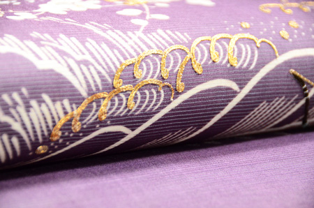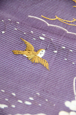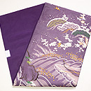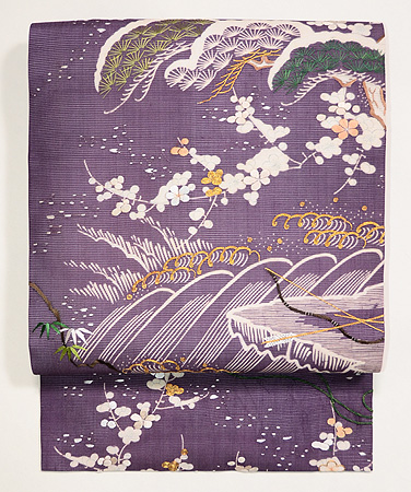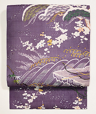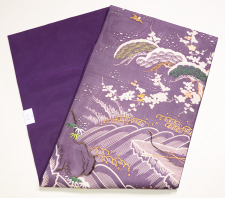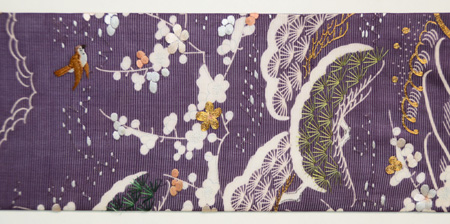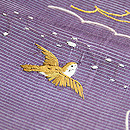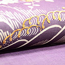 松竹梅に波千鳥の文様です。 帯17-5-19と同じ裂から仕立てています。 弓矢と、檜扇らしき文様がちらりと見えていますが、平家物語の那須与一の世界でしょうか。