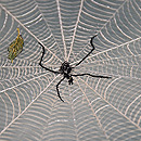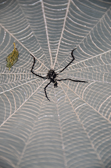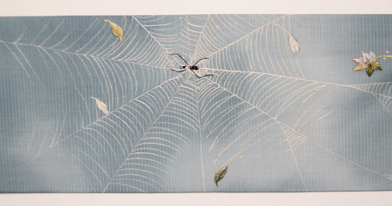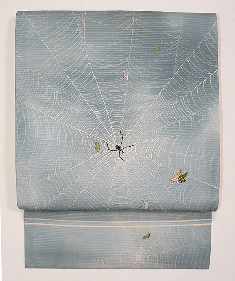 巣が縦横に張り巡らされた、クモにしては美しすぎる帯です。 アクセントの刺繍が効果的に効いて、涼感みなぎる夏帯です。