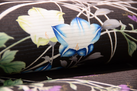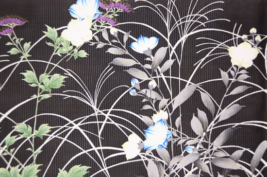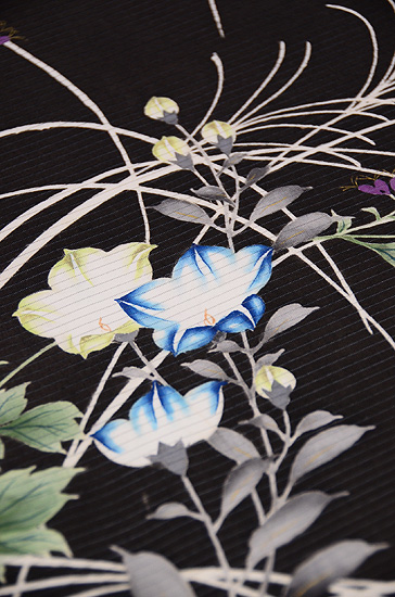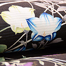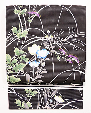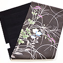 墨黒の涼しげな絽地に桔梗、おみなえし、ススキと美しい野の花が、咲く染帯。 華やかな中にすっきりとした「凉」を感じさせてくれる彩りです。 秋草ですが、これからの季節にもお楽しみください。