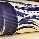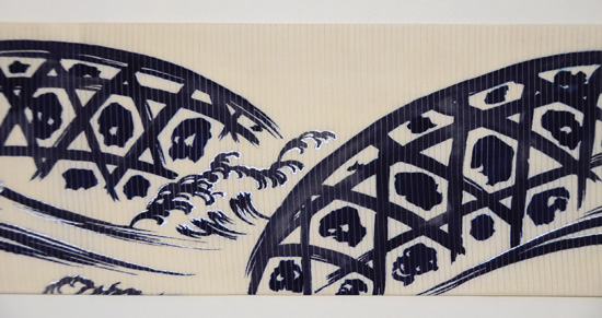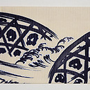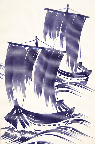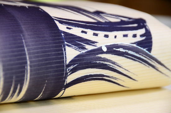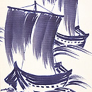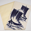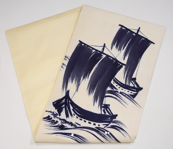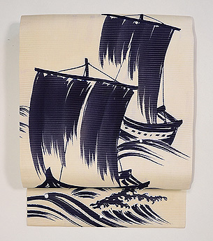 墨のタッチも明確に、荒海を渡る2艘の帆船。 前柄には蛇籠という、夏帯のモチーフとしては最高のテーマです。 水辺物、空を飛ぶ物、など自然界を手中にいれるようなお着物にあわせられます。