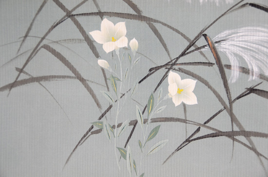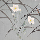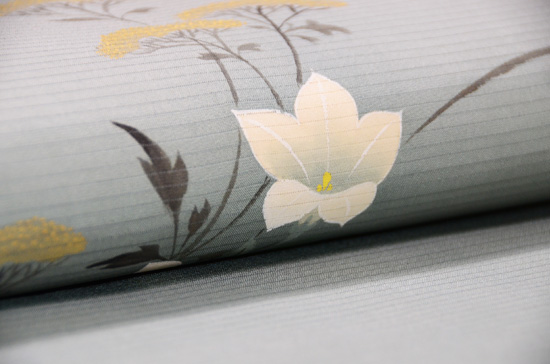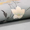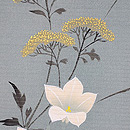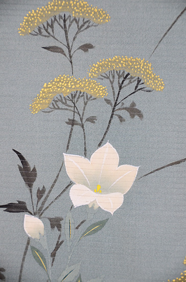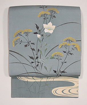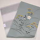深川鼠に近いグレー地に、秋を恋いる野の花を配して、晩夏から初秋の帯としました。 丸帯崩しなので、どこかはんなりとおおらかな表情がみられます。