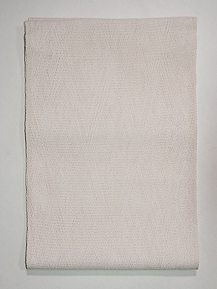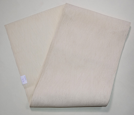 菱型の織り文様が美しい羅織帯。 涼やかなクリーム色が、着物に添い、風の通るような織りが、盛夏にも活躍してくれそうです。 松葉仕立て1丈3寸(約4m94cm)の長さです。 昔の袋帯かと思われますが、少し長めの名古屋帯としてもお召しになれます。