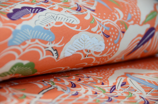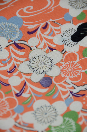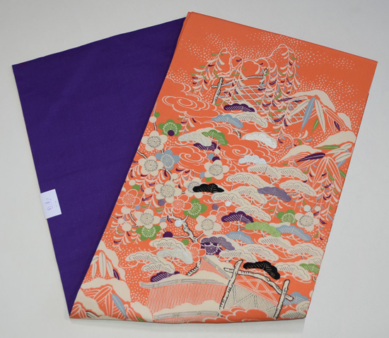 使いやすい染めの御所解文様です。 ポイントに刺繍が入り表情を変えています。 裏地にはあえて紫色の生地を用いて洒落た雰囲気に仕上がりました。