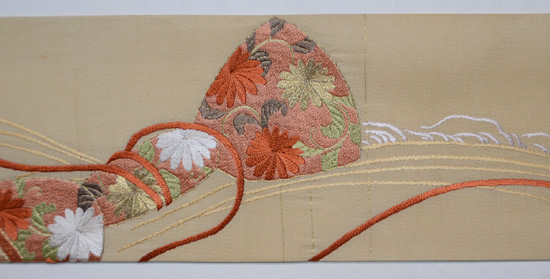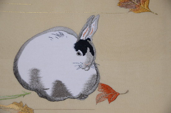 吹き寄せの中、白兎がうずくまっています。 コラージュに刺繍の当店創作です。告白しますと、お太鼓柄がなかったので、前柄に匹敵するボリュウムのあるものを考えていました。 前柄は鼓の胴部で、蒔絵がなされて典雅な様が表されています。