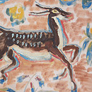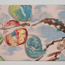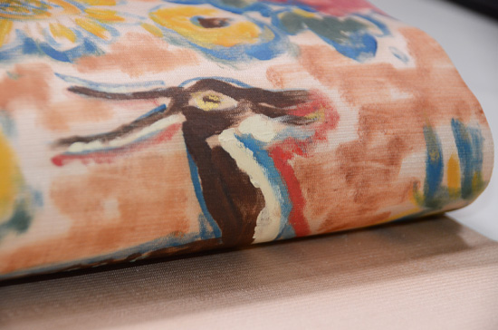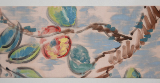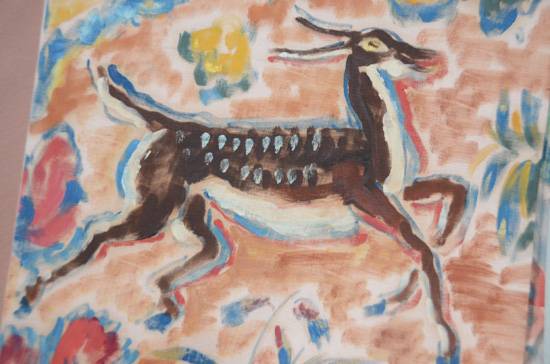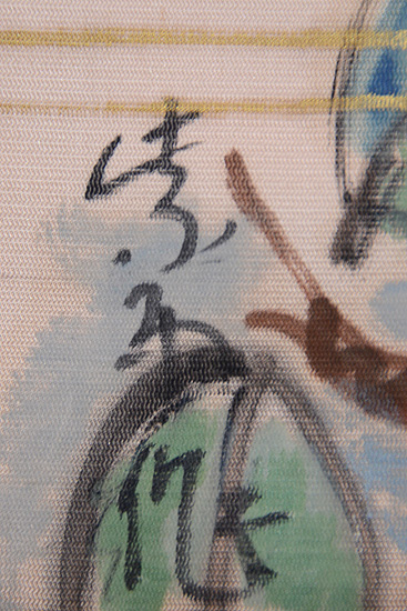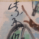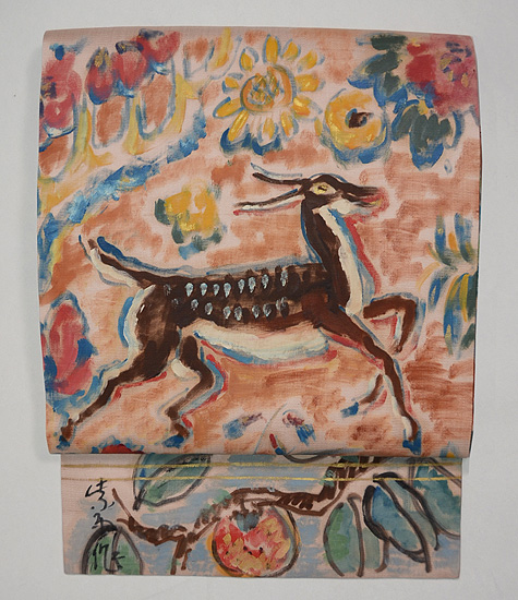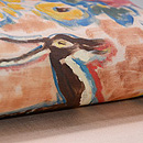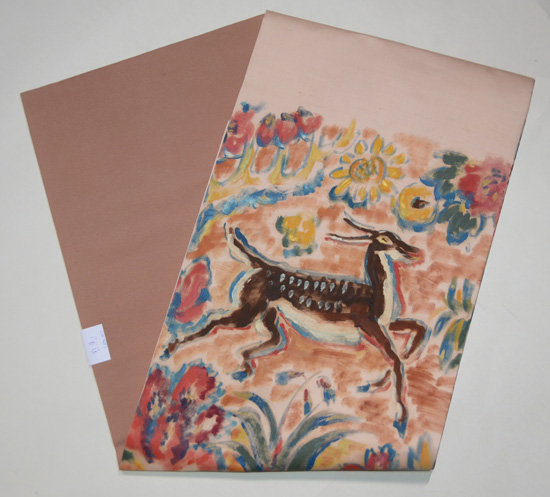 花園で遊ぶ鹿の様子が闊達に描かれています。 油絵の具のタッチでしょうか、筆使いの力強さと勢いが迫ってきます。 前柄にはリンゴの実が美味しそうです。 垂れ先にはサインも見えます。