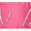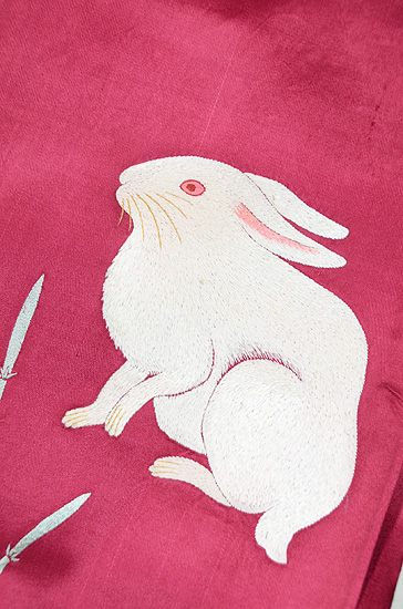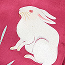 うさぎの目のような帯地の臙脂色、毛並みの白と木賊のいぶし銀。 色を多く使わず出来上がった白うさぎワールド。 短い耳と丸しっぽを寝かせて、片脚を少し上げた格好です。 小さな春の足音を見つけたのかもしれませんね。