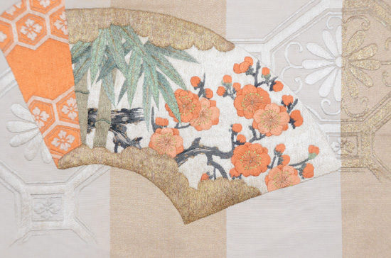 触ると柔らかな上質な手織りの綴れ帯ですが、これに刺繍をするのはどれほど骨の折れる仕事でしょう。 扇に貼る地紙の中に竹と紅梅が、配された華やかな胴前と檜扇に若松と笹が、刺繍された立派なお太鼓の図。 垂れ先の多色の刺繍にも目を見張ります。 古くから能装束や小袖に使われてきた文様は、優雅でおめでたい装いに格調高い美しさを添えてくれます。