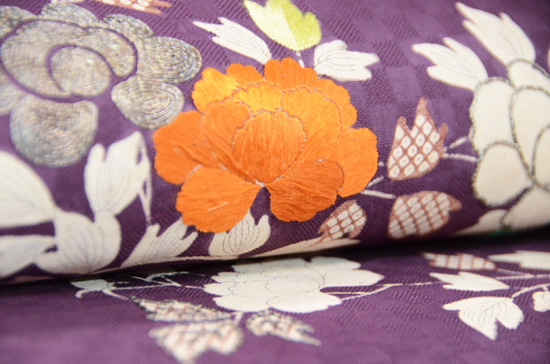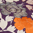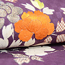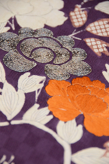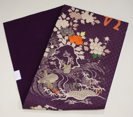 小袖くずしの江戸裂名古屋帯です。この時代の天然染料を使った、珍しくも美しい紫色にご注目下さい。 牡丹が咲き乱れる清流の滝を泳ぐ鯉は、時を忘れているようにみずみずしく呼吸しています。 刺繍の糸の細さにも驚かされますが、むしろ悠久の流れを感じる大らかな魅力の名古屋帯に生まれ変わりました。 繊細な布ですので、お取り扱いも姫君クラスでお願い申し上げます。