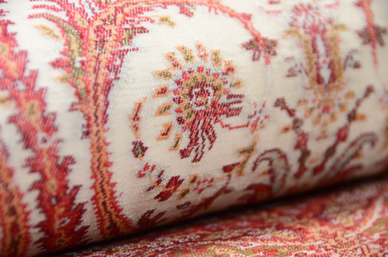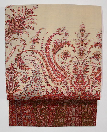 アールヌーヴォーを彷彿とさせるジャガード織りのショールでした。 糸が細いので、赤い曲線が白地の中に流れていく様が繊細で、赤と白の色がどんどん冴え渡り、美しくなってきます。 眺めていると、なぜか迫力さえ伺えます。 帯になって、愛されていくことでしょう。