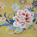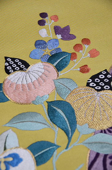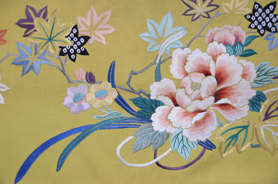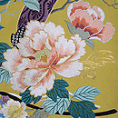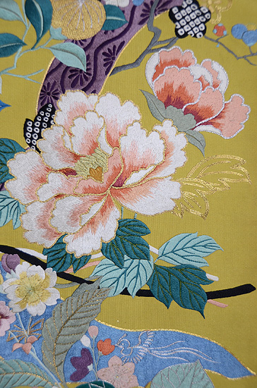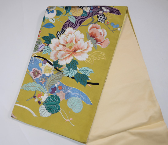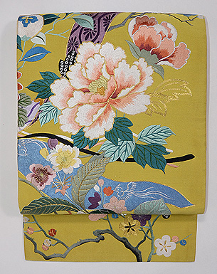 ぼたんを主役に、四季の花が豪華に咲きそろっています。 綴織りの上にこれだけの容量を刺繍する作業には、鍛錬の積み重ねが想像されます。 再現できないであろうものに出逢う感動を、お客様にお伝えしたいです。