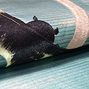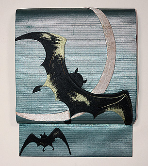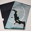 月とコウモリの開いた羽根とがシンメトリーとなって、ダイナミックな構図が印象に残る帯です。 青緑に銀糸を加えた9本絽の地色も、夜の闇を照らすにふさわしく、コウモリの勇姿?を浮かばせてくれます。 昭和初期に流行った頃の作でしょう。