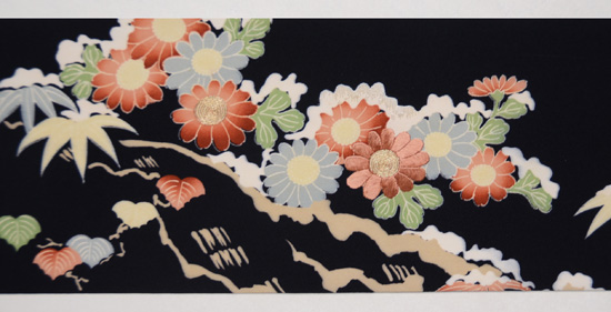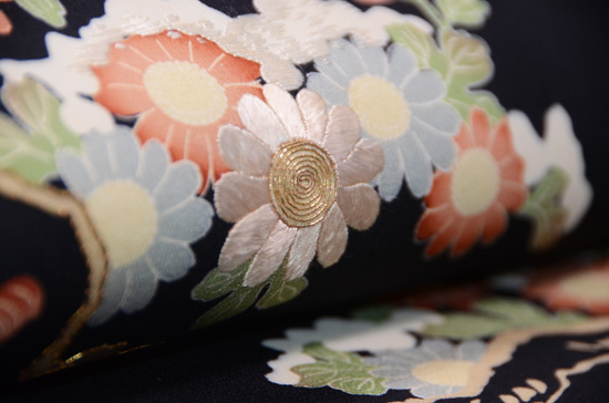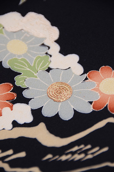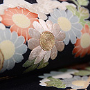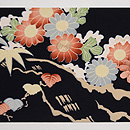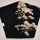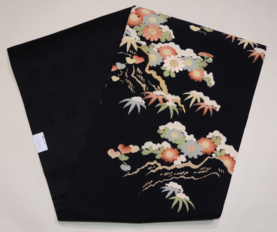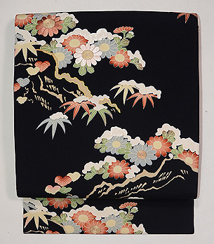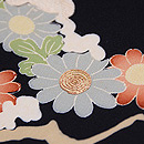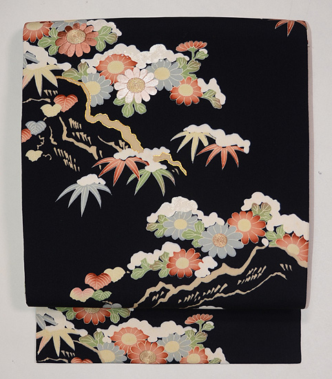 黒地縮緬に、お庭に積った白い雪が映えて、絵画のような美しさです。 雪が積もった残り菊は、新しい年の風情でもありますし、これからもお召しになれる帯としておすすめします。
