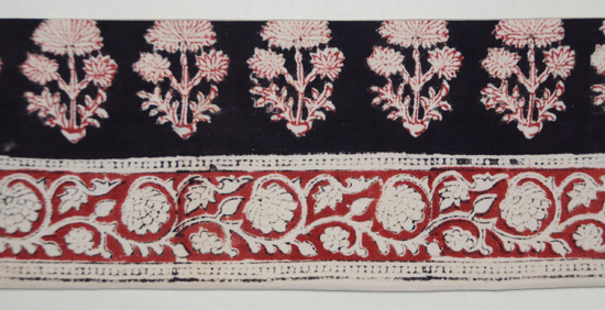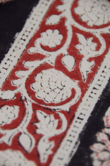 花唐草がボーダー状に並んで、スッキリと優しくてかわいいデザインの更紗です。 近年の染めですが、糸味も色も良く、帯にはふさわしい素材と言えます。