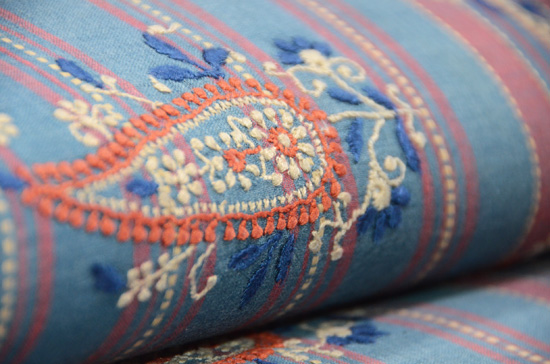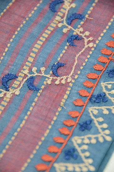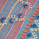 ポコポコとまーるい刺繍がかわいく、リズミカルに踊っています。 元来は、イスラム教の男性の白い帽子に刺されていた刺繍の技術ですが、サリーとなって現れ、今は帯となってお店に並んでいます。