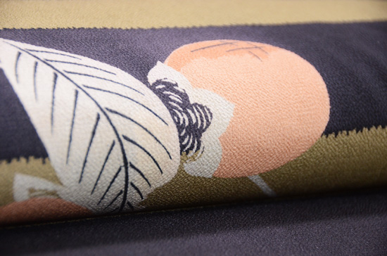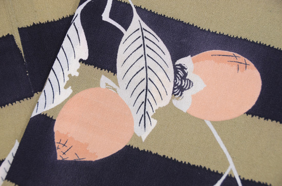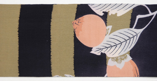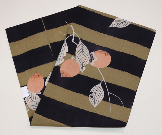 縮緬の着尺でしたが、手に入れた途端に、これは帯だと決められた裂でした。 太い黒い縞に、おおきな丸い柿。 このインパクトは、帯でこそ活かされます。 さあ、この秋は、紬が着たくなってきましたね。