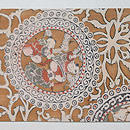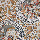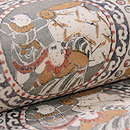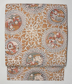 丸紋を唐草で繋いで、異国情緒たっぷりの文様です。作られた時代は、洋行もかなわずに、その夢がこういう所に託されていたのでしょう。 当初はお布団だったり、風呂敷だったりしていたようですが、ここに帯として登場しました。