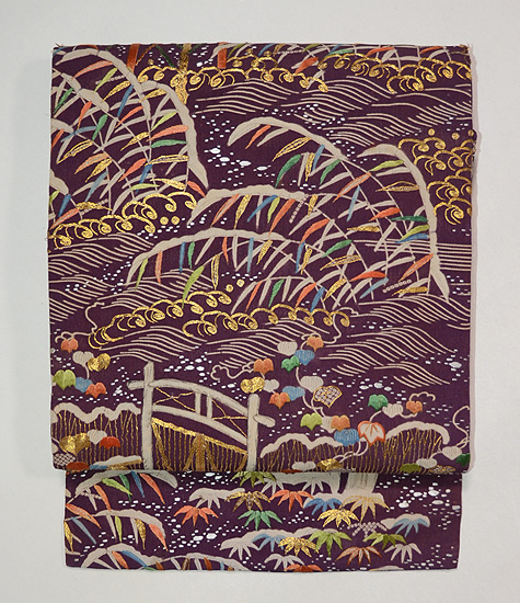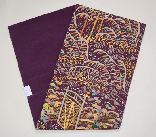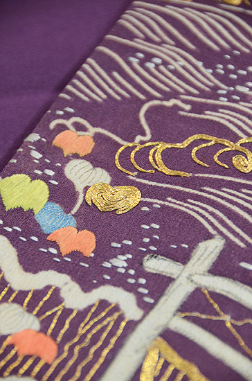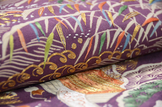 芦辺に打ちつける波の音がザーザーと聞こえて来そうな、臨場感漂う文様です。 手前に柴垣門と向こうに網干の光景が見え、出ない所には、源氏車や桜の花も垣間見えますが、元は江戸解きの衣裳だったのでしょう。 格調が偲ばれます。