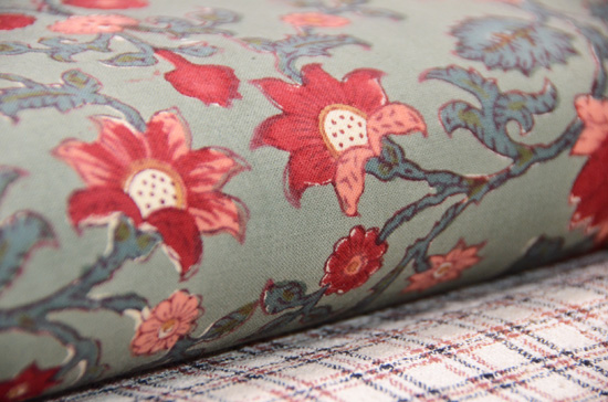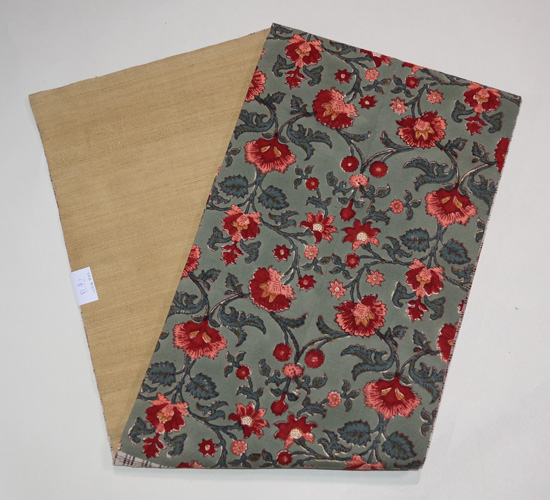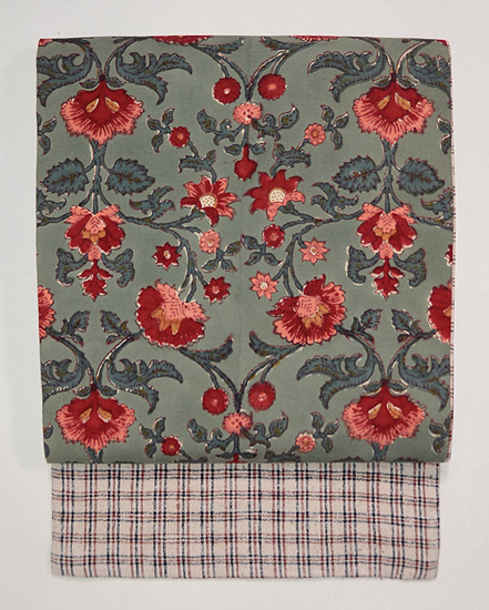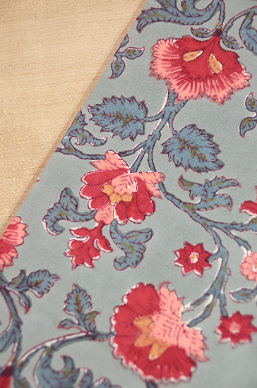青緑に赤い唐花がかわいい更紗です。