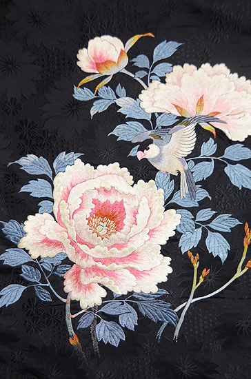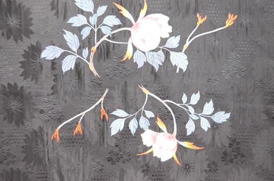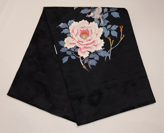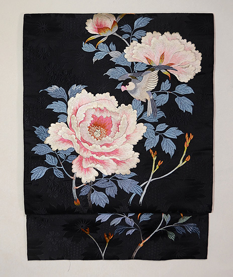 艶やかな緞子地に、牡丹の花びらの重厚な趣が溶け合って、豪奢な帯のお目見えです。