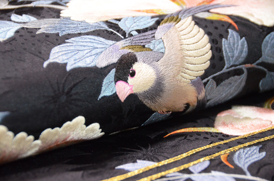 牡丹にヤマガラの丸帯 帯裏 牡丹にヤマガラの丸帯 前柄 牡丹にヤマガラの丸帯 質感・風合