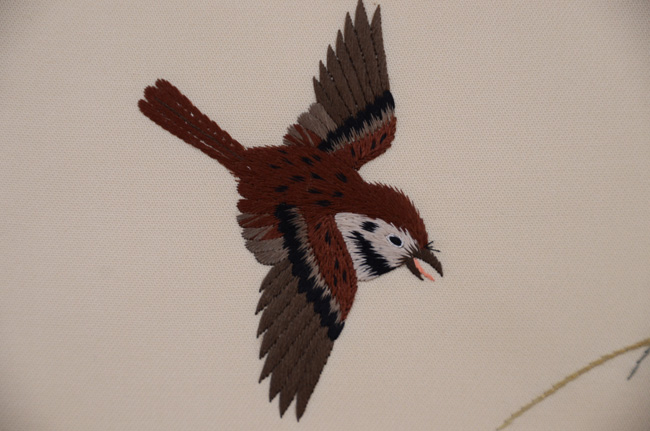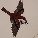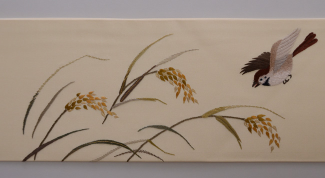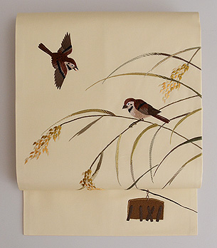 稲穂がたわわに実り、うれしい秋がやってきました。 雀たちもおこぼれに預かろうと、動きが活発になってきました。 これは創作オーダー帯10番としてうけたまわっております。