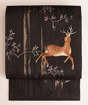 緞子織のようですが、ゆるぎのないしっかりとした帯地の迫力が、美しくもあり、それに負けないような鹿の姿を刺したつもりです。