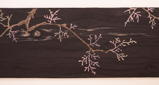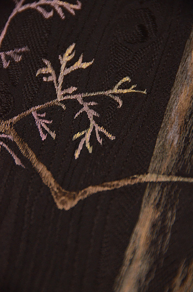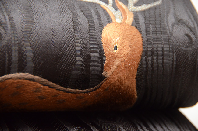 木目調の地紋起こしをしてあった刺繍の上に、鹿の刺繍を乗せました。