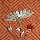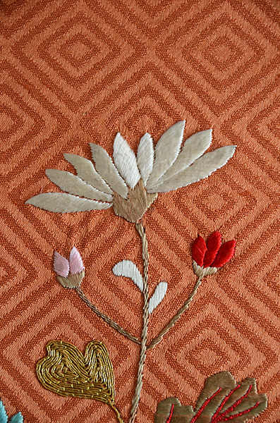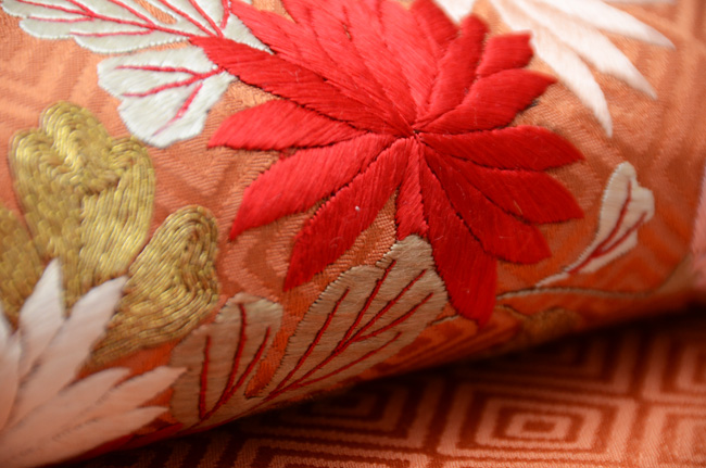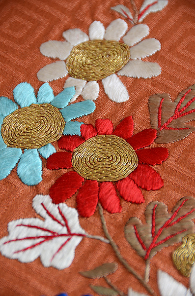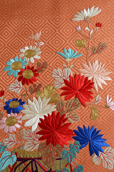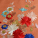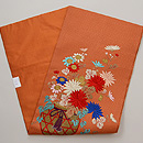 ぽってりとした菊が、花かごいっぱいに盛られています。 入小菱の地紋が、明るい朱色で、帯の格をあげています。 柔らかものよりも、むしろ紬でしたら、年齢に関係なく、こんなにかわいい色もお使いいただけます。