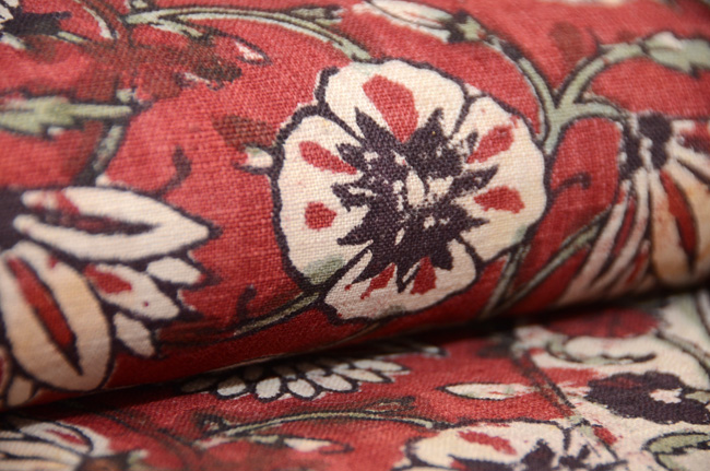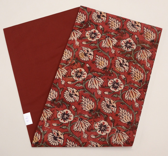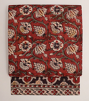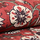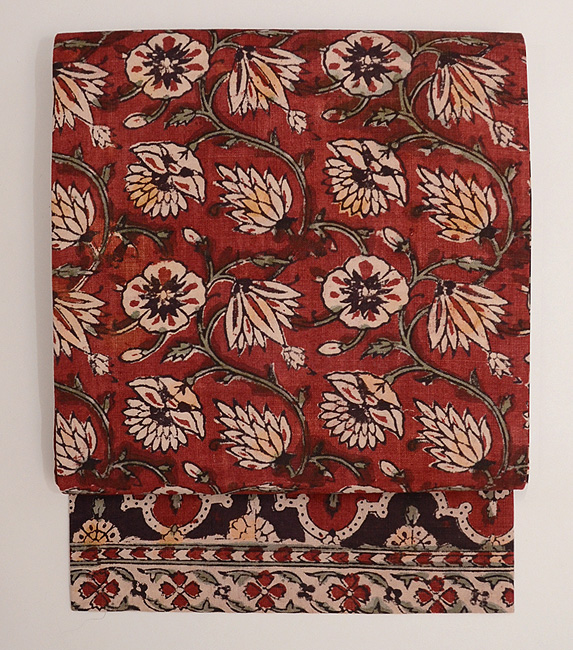 文様の線も美しく、きれいな茜がキッパリと染め出された染色技術の高い鬼手の更紗です。 六通名古屋帯に仕立てました。