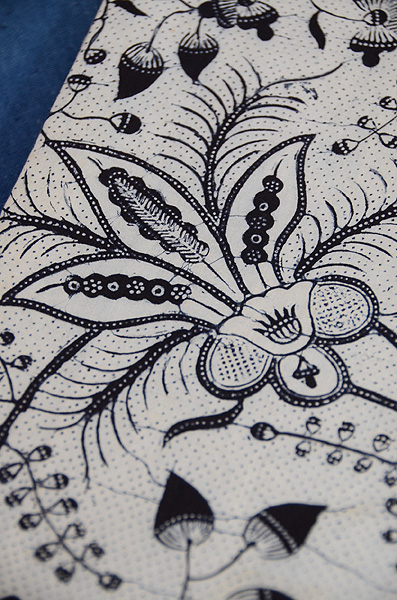 インドラマユという所のバティックを帯にしました。 白地にチャンチンで模様描きした後に、点描を加えています。 繊細で清潔感のある帯になっています。