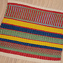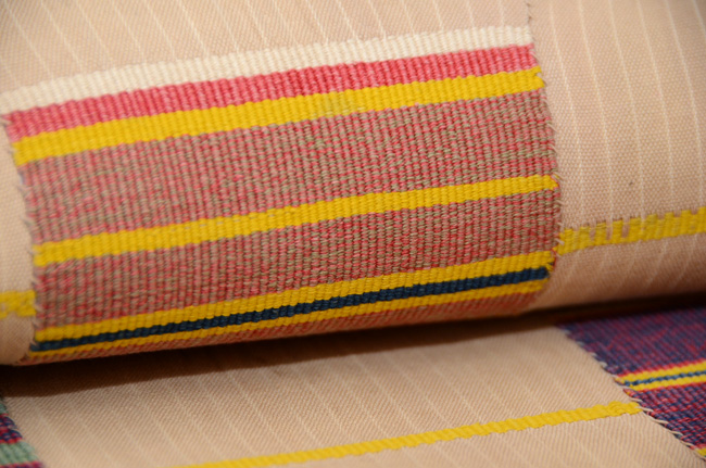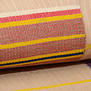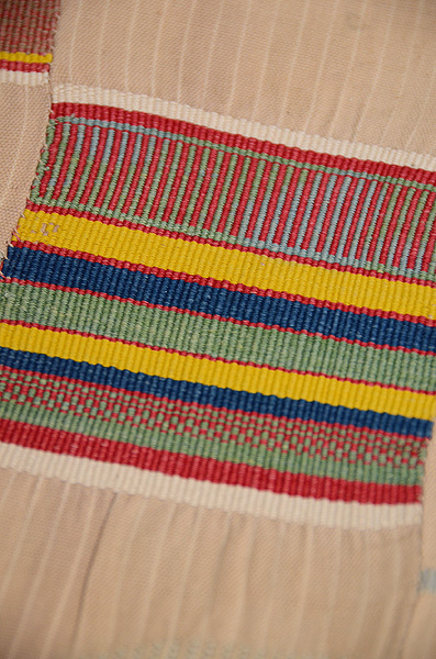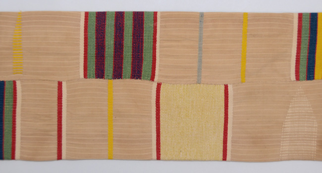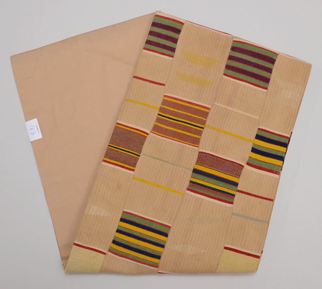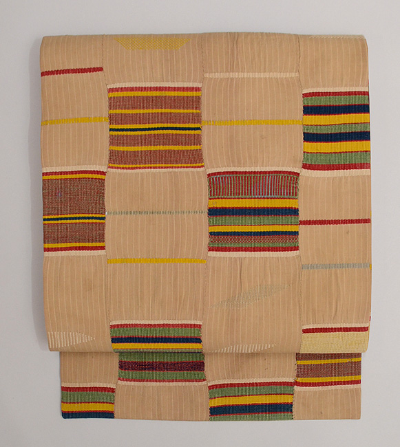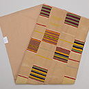 アフリカ西海岸のエウェクロスと言われる縞を織り込んだ織物です。 巾11センチの細い布を器用に繋いで広幅として、腰布に使っています。 これは、厚さもそれほどではなく、六通の名古屋帯なので、使い勝手がよく上がっています。