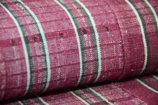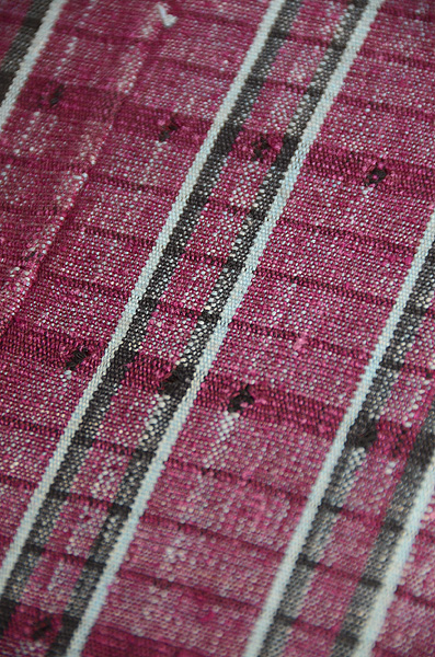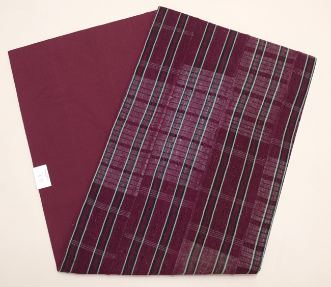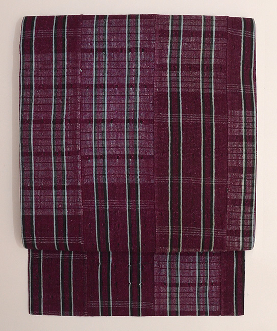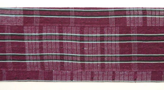アフリカの布は11センチ巾で織られていますが、それに小さな穴を規則的にあけています。 ヨルバ族のお祭りの被り物にも穴が空いているので、表が見えるように?かもしれません。 いずれにしても深い紫に2色の縞が走った、少しエキゾチックな帯になりました。
