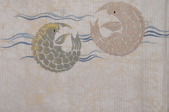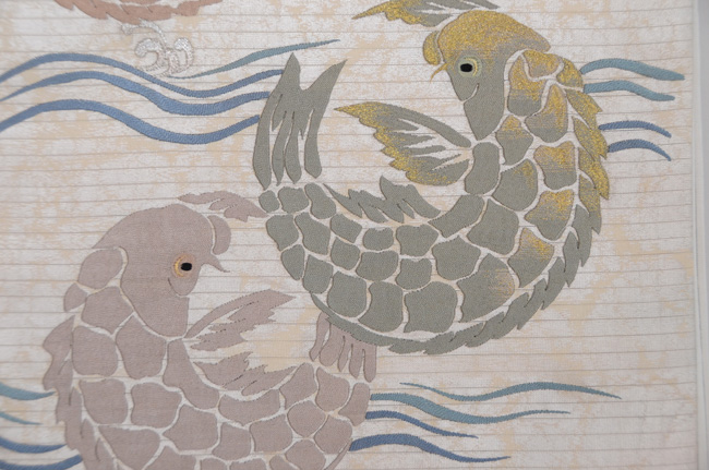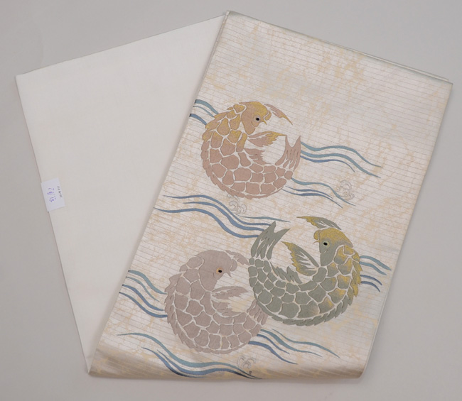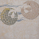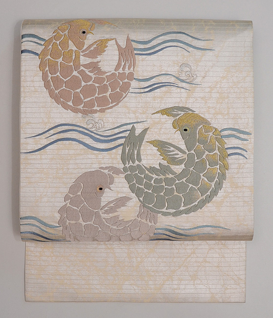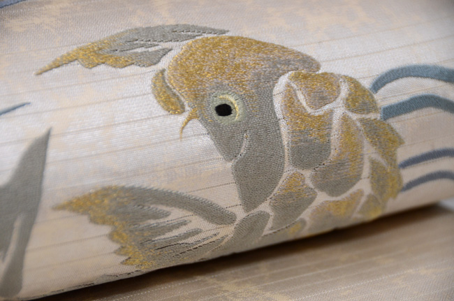 大きな荒磯文が立体的に刺繍されて、端正で品格漂う帯になっています。 緯糸に銀糸が織り込まれているのですが、その糸の銀箔を、あらかじめ意図的に削ってから織り込んでいるようで、それが泥銀のような錆を帯びた趣を作っています。 前柄もすばらしくて折れないので、昼夜帯にしてみました。