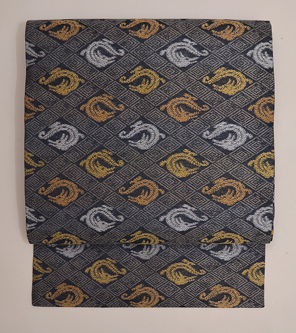 入子菱は、連続文様として縁起物と捉えられ、有職文様にも取り入れられています。 雨龍は雨乞いの象徴として大地に恵みをもたらすもの、運気を高めるものものとして、瑞龍とされています。 夏にふさわしい文様の名古屋帯です。