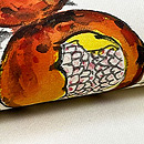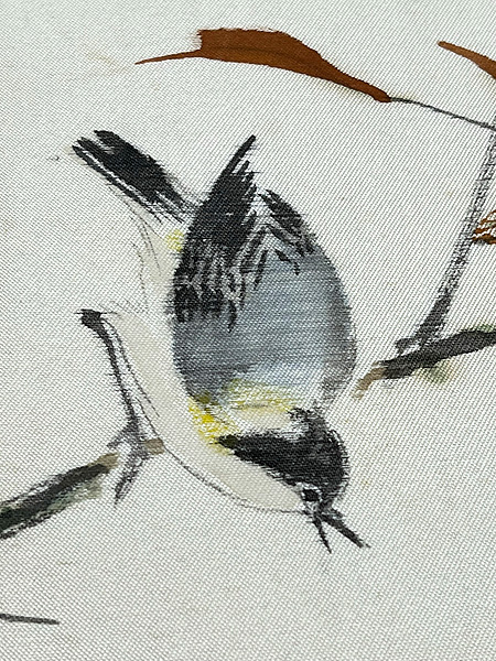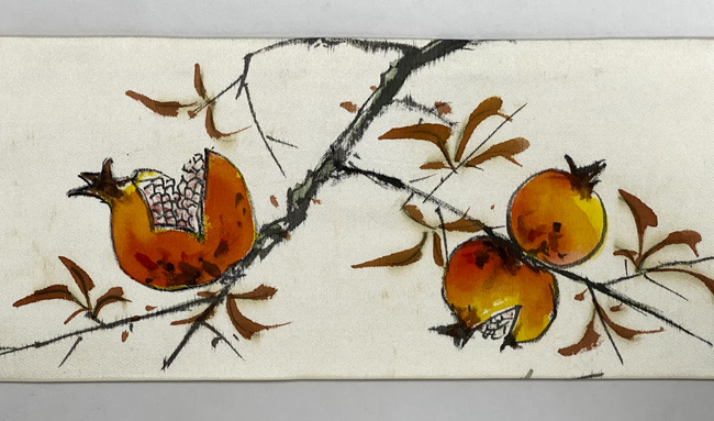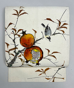 大きく実ったザクロの枝に、モズが一羽獲物を探しています。 種をいっぱいつけて、繁栄の象徴とも言われるザクロは、古今東西で愛されてきました。 渋めの紬には、この様なダイナミックな帯を、いかがでしょうか。