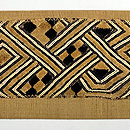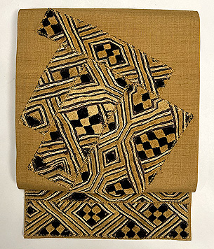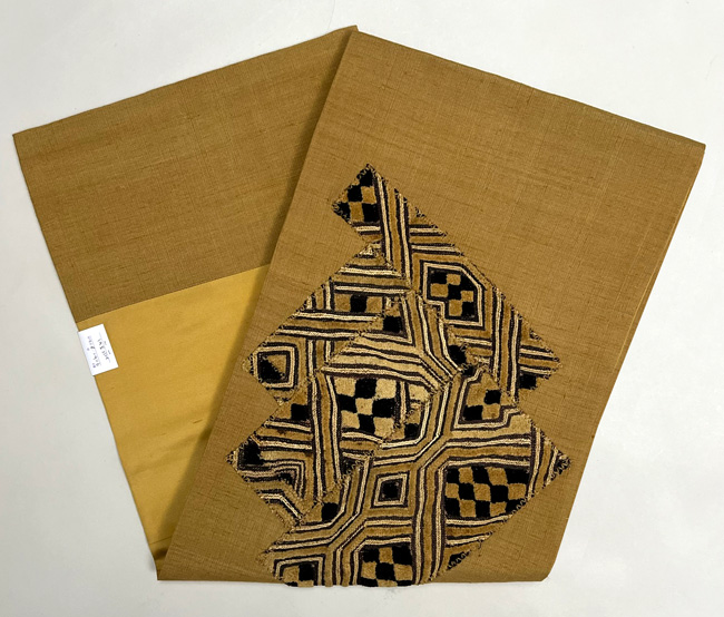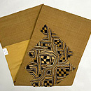 辛子色の紬地に貼り込まれたラフィアの布が、生き生きと躍動して、モダンな帯になっています。 結城など、しっかりと織られた紬との相性は、すばらしいと思われます。