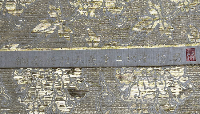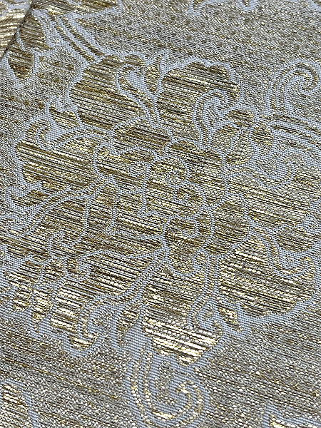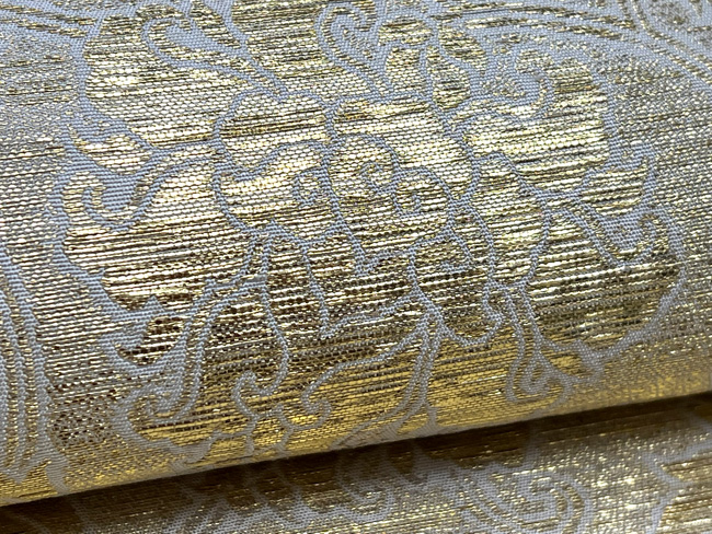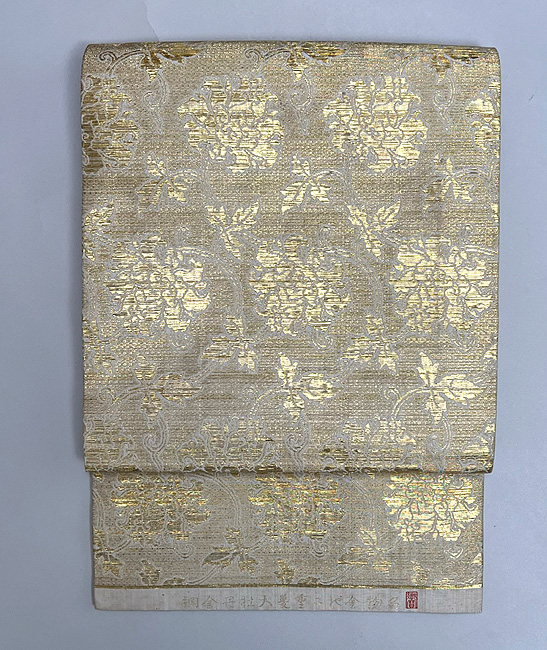 美しい金糸で、牡丹の花が拡張高く織り込まれています。 銘の裏には「昭和丁酉 龍村平蔵製」とありますが、ひのと とり、というのは西暦1957年、昭和32年に当たります。 終戦10年という節目に、制作年をあえて織り込んだのでしょうか。 巾8寸ですが、丈は1丈2尺と長く、蔦の柄の上下もありませんので、非常に使い勝手の良い丸帯のようです。