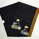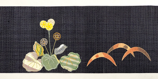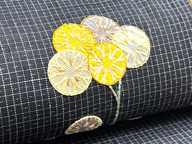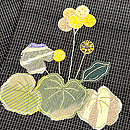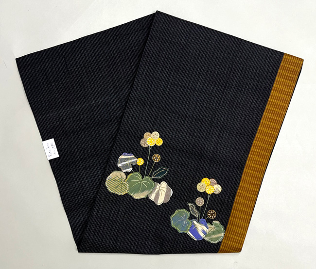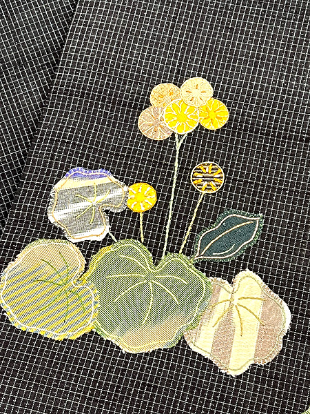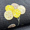渋い紬地を合わせて、上につわぶきの花をのせました。 季節を問わず、艶やかな姿を見せる葉っぱは、ウズベキスタンのアドラスを充ててみました。 黄色いかわいい花に合わせて、どこかエキゾチックな香りがしてくるのもうなずけますよね。