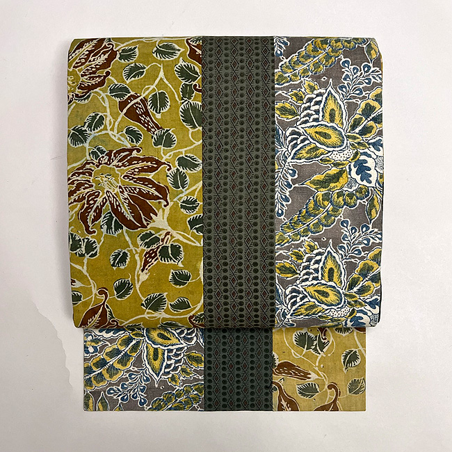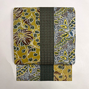 優しくしなやかな色味の和更紗を合わせて、春の名古屋帯としました。 茶やベージュ、グリーン系の着物にあわせての装いをお楽しみいただけます。