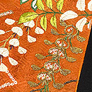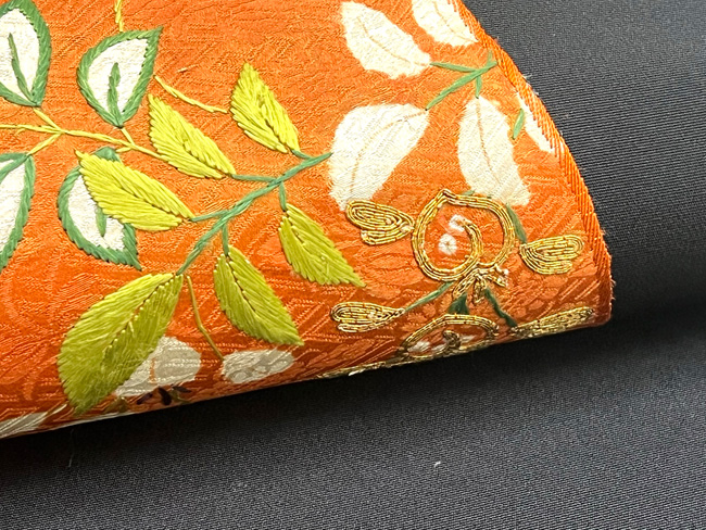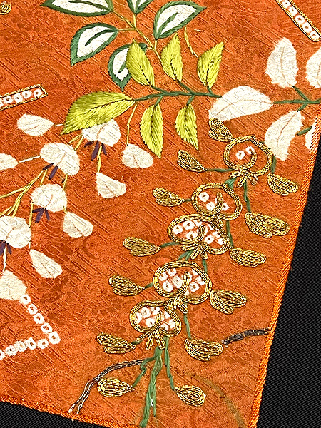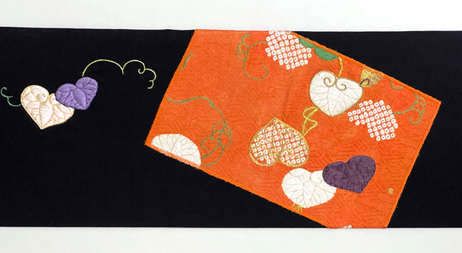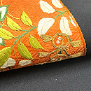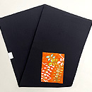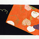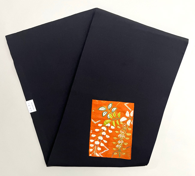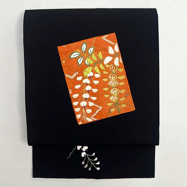 黒地の塩瀬羽二重に江戸裂をコラージュした灯屋2の創作帯です。 江戸の小袖の中でも紅花の朱色地はとても珍しく、胴前の双葉葵、お太鼓には藤の江戸裂を置きました。 余白の胴前と垂れ先に刺繍をたしました。 柔らかな感触で安心するようなきれいな織り、昔の塩瀬羽二重の帯地です。