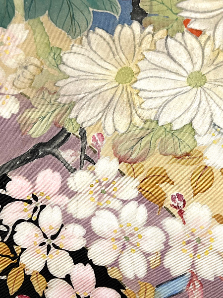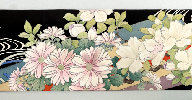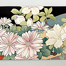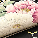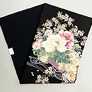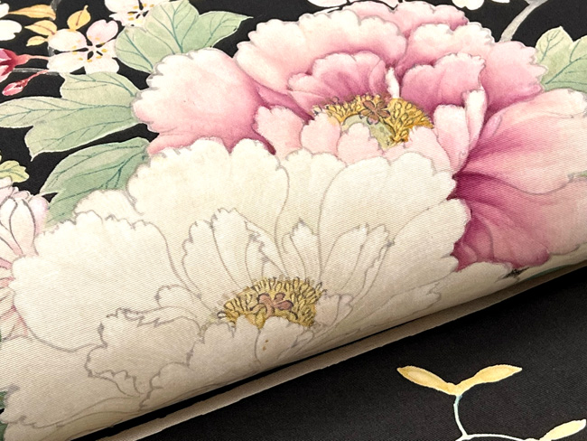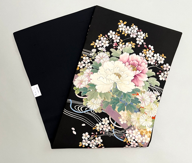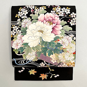 芍薬の優雅な姿が、美しいお太鼓模様。 胴前の可憐な彩りも他の帯にはない、華やかさです。 丁寧に糸目友禅された図柄と上質な塩瀬の黒い地色。 友禅染めの丸帯を帯23-02-05と2つに分けてお仕立てした、雅な帯が出来ました。