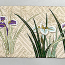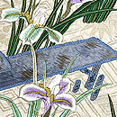 伊勢物語に由来する八つ橋文、橋にかきつばたが、ここではぽってりとした刺繍で表現されています。 前柄にもかきつばたが凛々しく咲いています。 紋意匠の花紗綾型紋で、雅な物語が完成というところです。