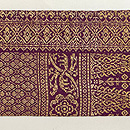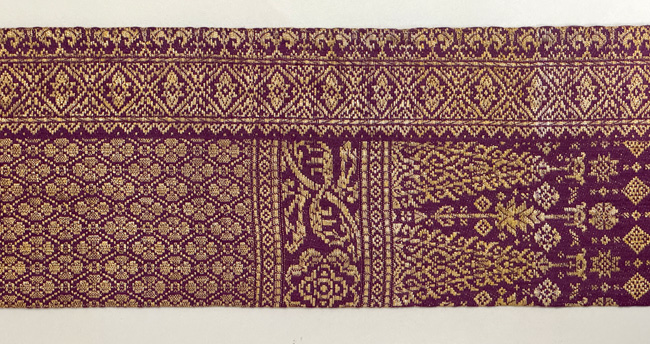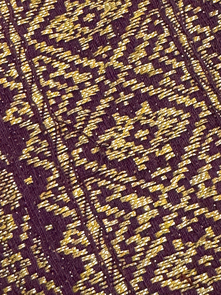 銀糸の緯紋織が繊細で美しい名古屋帯になりました。 これはスマトラで男性の結婚式の装束に使われていたものでしょうか。 自然界から星や花などを形どって模様にしていました。