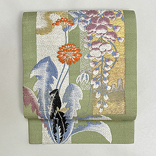 藤にたんぽぽの名古屋帯 帯裏 藤にたんぽぽの名古屋帯 前柄 藤にたんぽぽの名古屋帯 質感・風合